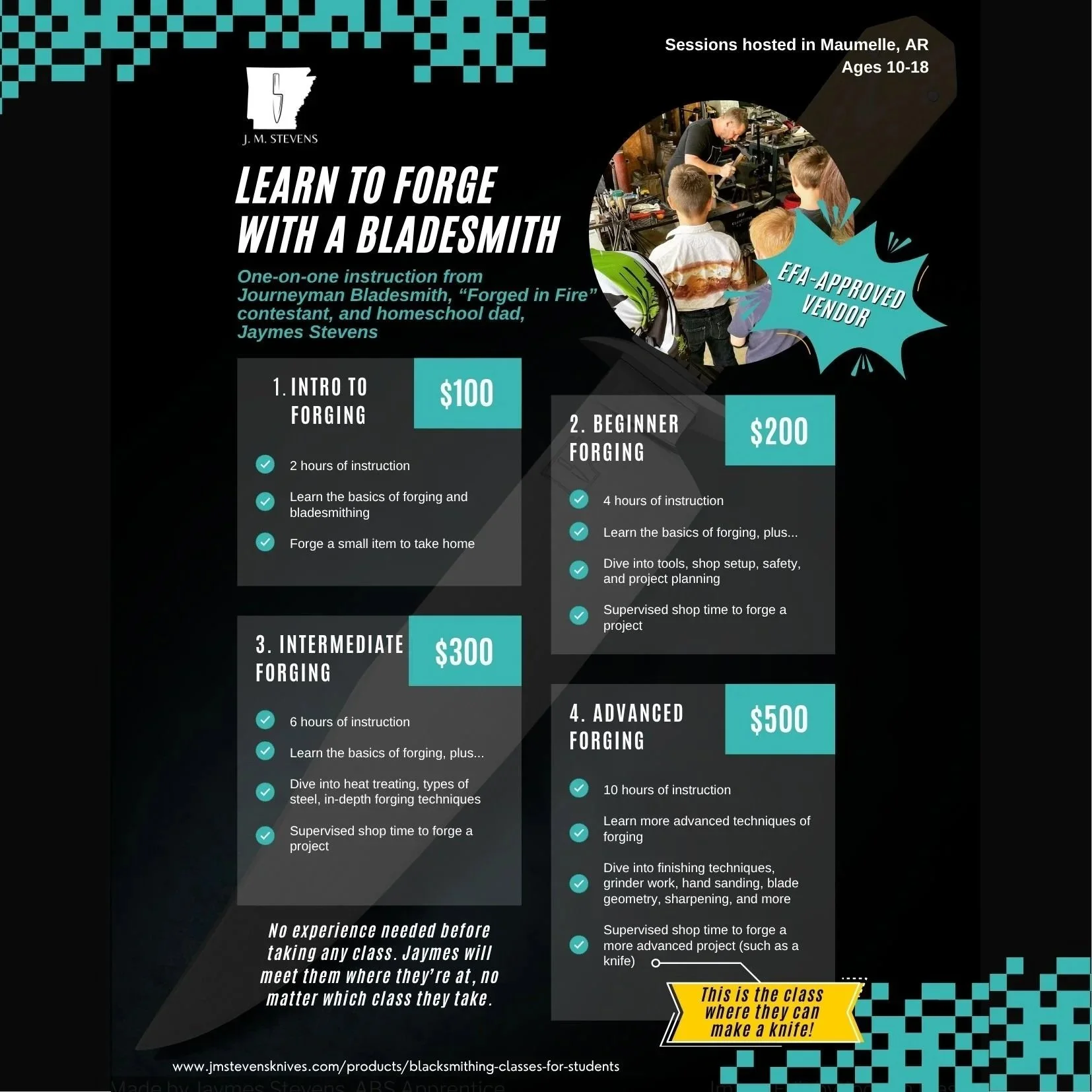 J. M. Stevens Forge (Maumelle, AR) offers Blacksmithing Classes for students age 10-18! These classes are sold in 2-hour increments up to 10 hours. Parents can purchase multiple sets if they want more hours.