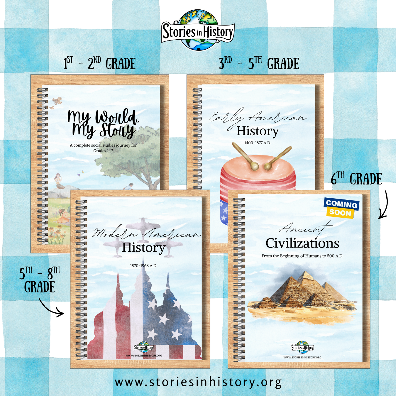 Engaging, literature-rich social studies curricula for homeschool families with elementary and middle school students. Nationally standards-aligned (C3 Framework), written from a neutral worldview, and filled with hands-on, fun activities—designed with minimal prep for parents.