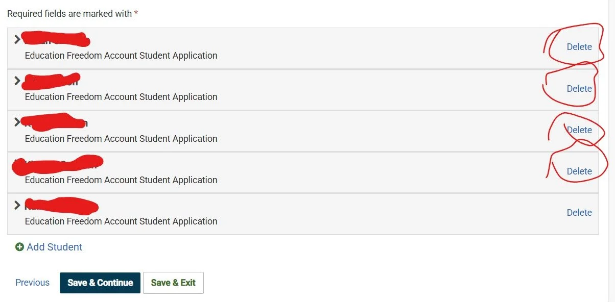 This page has all of your current student/students listed and a spot right below them is says to ADD STUDENT. HERE YOU NEED TO DELETE STUDENTS THAT ARE ALREADY FUNDED. ONLY LEAVE THE INFO FOR THE STUDENT YOU ADD.