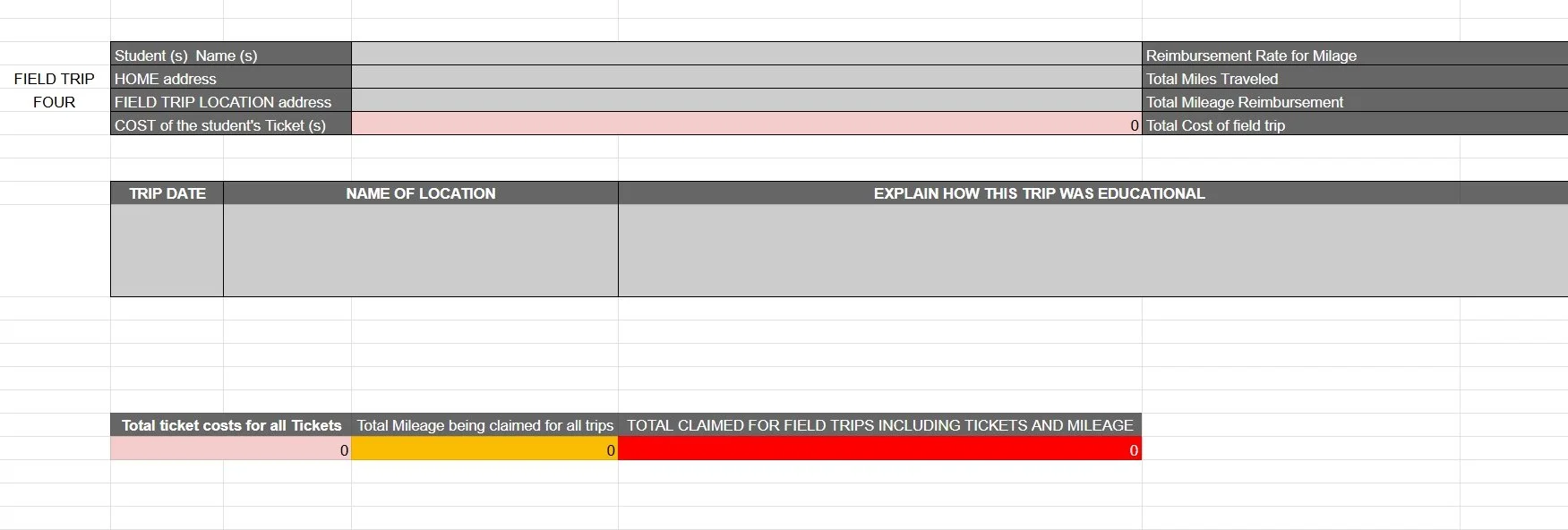 To access a spreadsheet for calculating mileage and fees for field trips. This is meant to be submitted monthly at most with the receipts for the trips included. You choose MAKE A COPY to use the sheet. Fill in ALL LIGHT BLUE FIELDS and the pink fields for costs of tickets and total miles traveled. Input the TOTAL round trip miles calculated from your home to the address you have on the spreadsheet then back to your home. The receipts MUST be uploaded along with the spreadsheet.