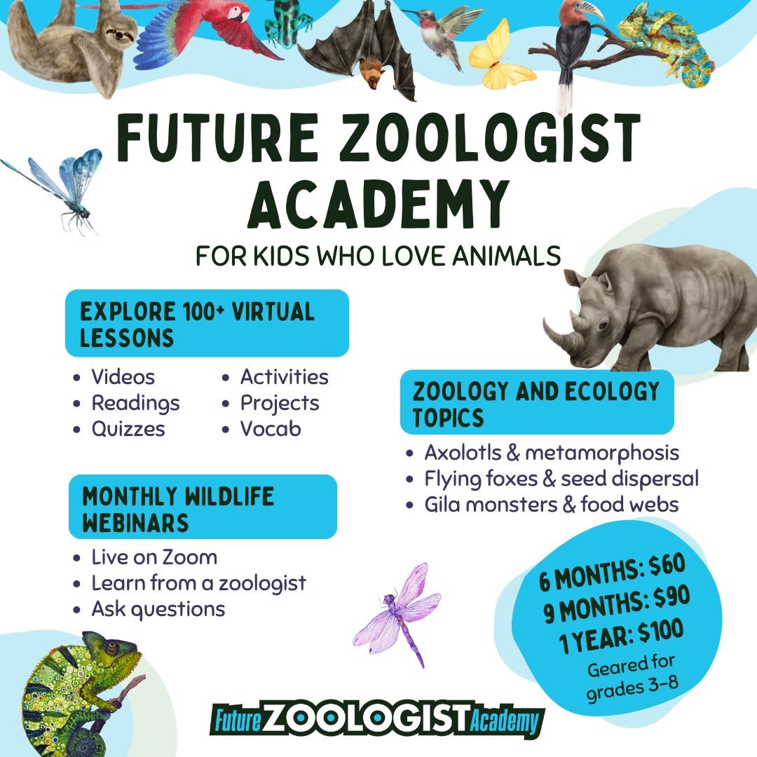 Future Zoologist Academy is a virtual zoology and ecology program for students in grades 3-8. Members will explore more than 100 comprehensive lessons, each in including a video, readings, quizzes, activities, projects, vocabulary, and more.