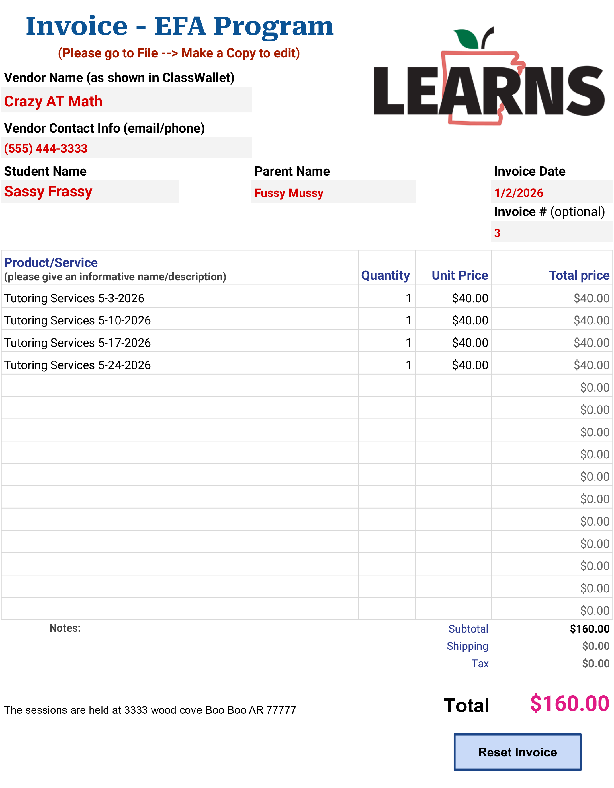 Those details of the students need to be ON the invoice. Aside from their information you must provide yours: