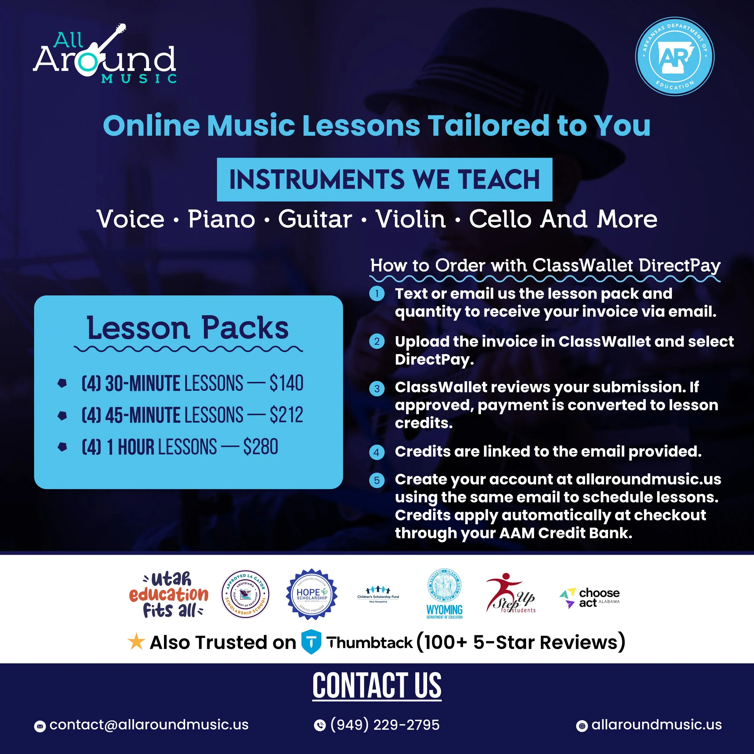 5. Create your account at allaroundmusic.us using that email to book lessons. Credits will apply automatically at checkout through your AAM Credit Bank.