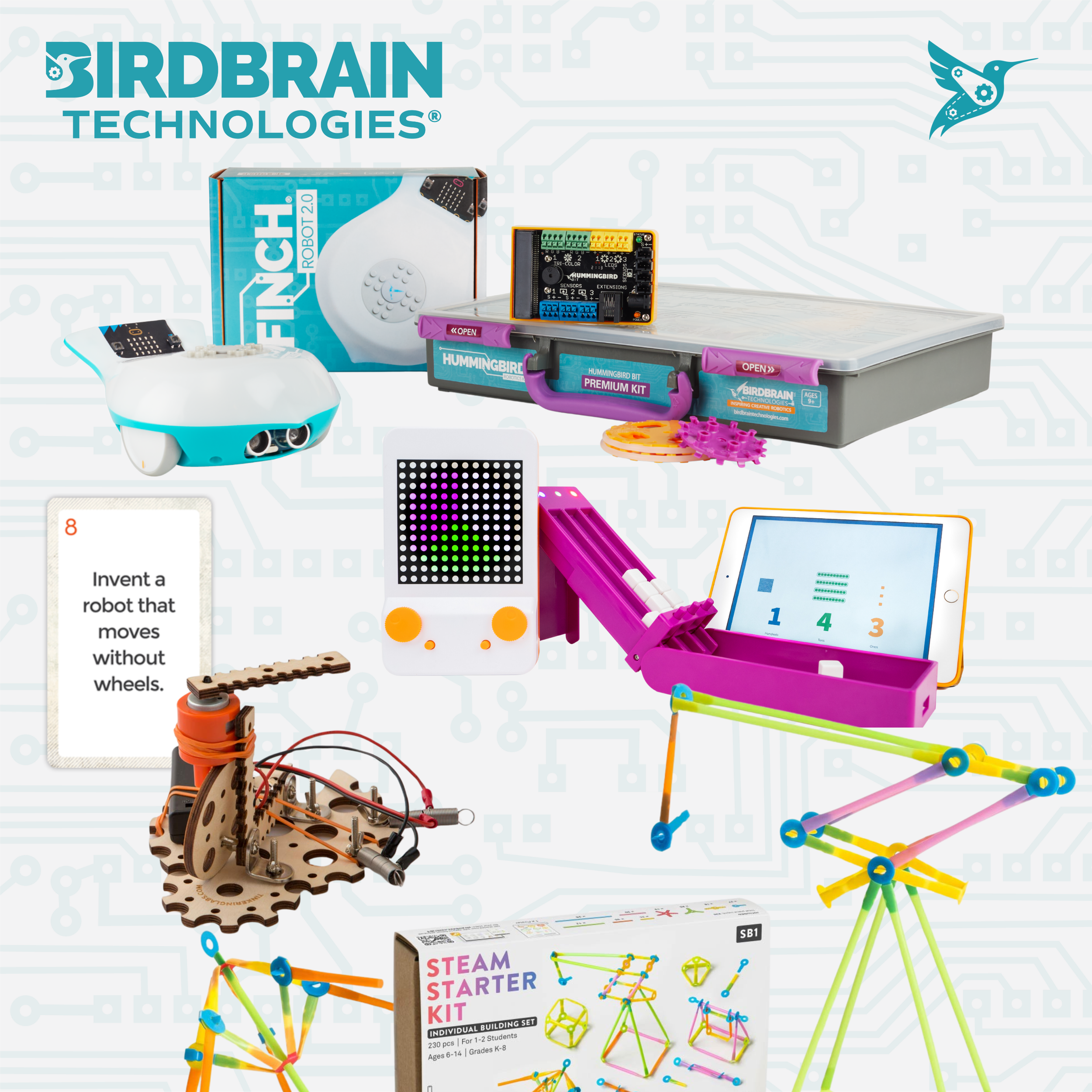 BirdBrain makes abstract STEM concepts hands-on by providing flexible learning tools: the Finch Robot (Gr K-12), the Hummingbird Robotics Kit (Gr 3-8), Owlet Math Tools (Gr K-5), Strawbees (Gr K-8), and the Screen-Free Catalyst Kit (Gr 3-6).